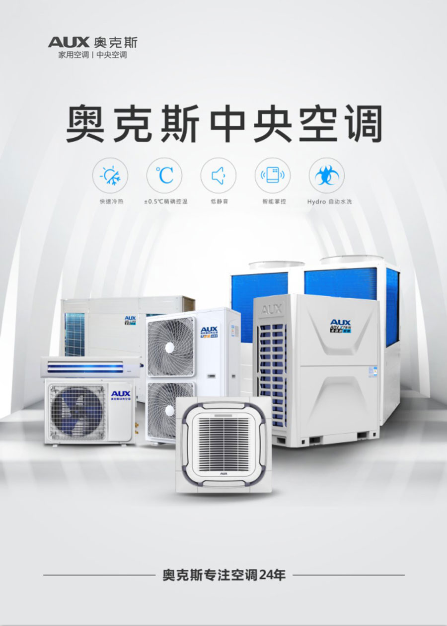 主要产品:奥克斯AUX多联式空调(热泵)机组;模块式风冷冷(热)水机组;风管送风式空调;单元式空调机;分体嵌入式空调;低温空气源热泵机组;风机盘管;空气处理机