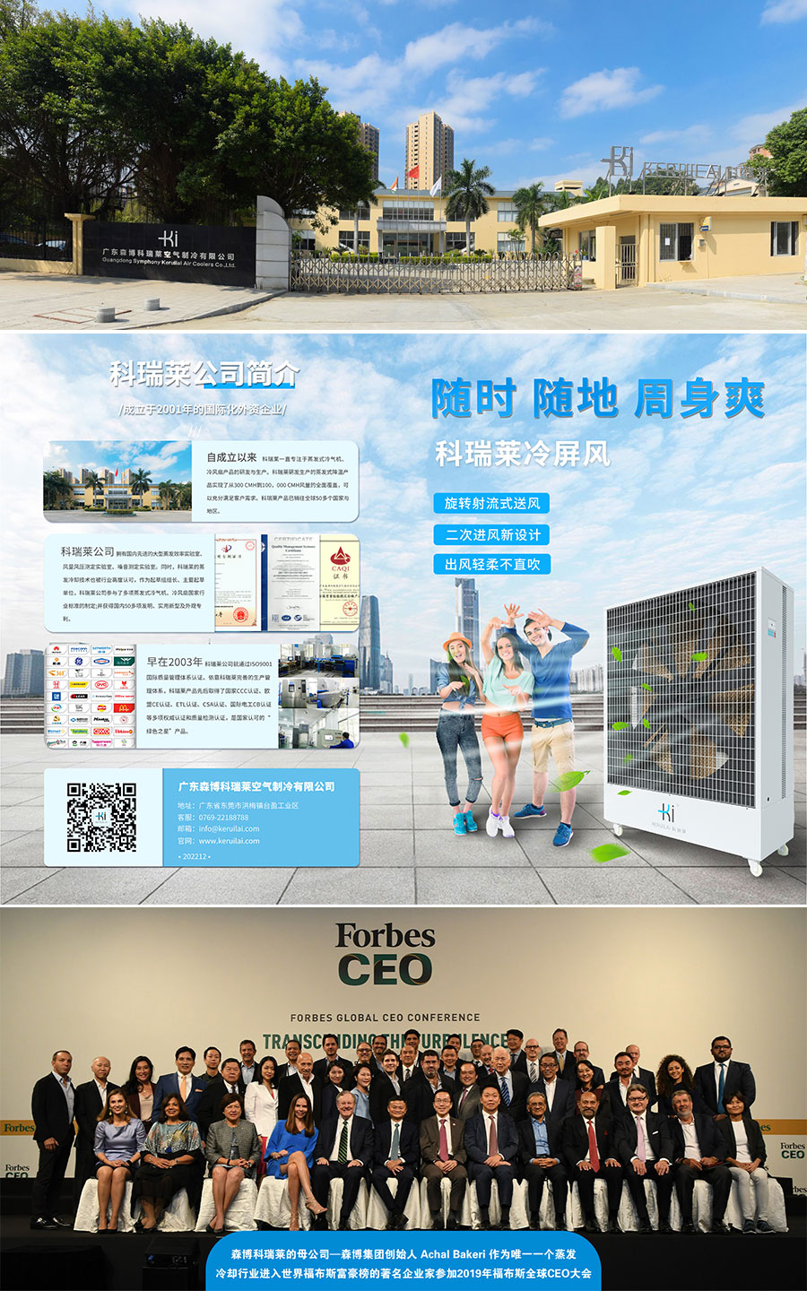 广东森博科瑞莱空气制冷有限公司现拥有国内先进的大型蒸发效率实验室、风量风压测定实验室、噪音测定实验室。同时,科瑞莱的蒸发冷却技术也被行业高度认可。作为起草组组长、主要起草单位,该公司参与了多项蒸发式冷气机、冷风扇国家行业标准的制定,并获得国内50多项发明实用新型及外观专利。