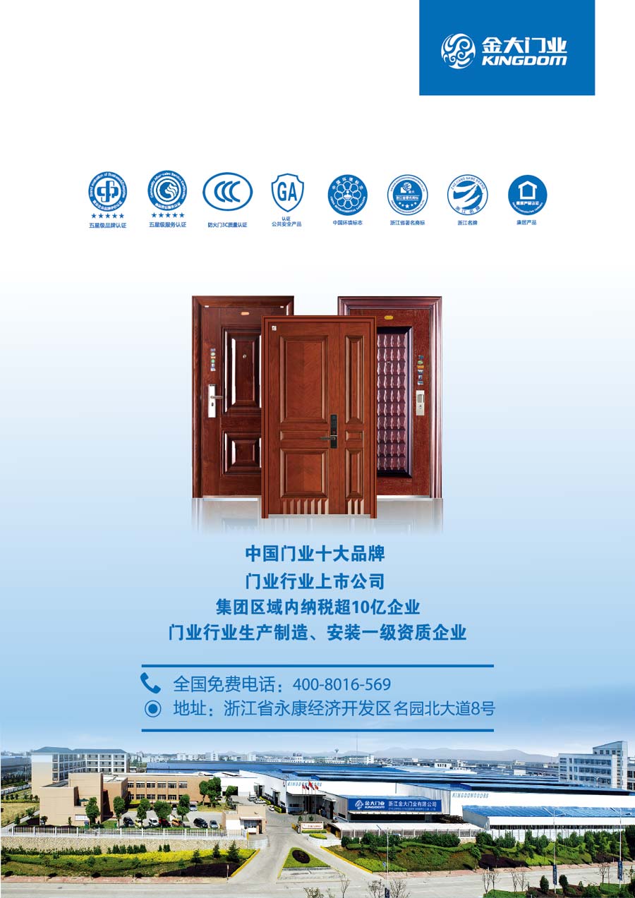 金大门业公司使命:向顾客提供优质、可靠、环保和款式新颖的门系列产品,装饰人类居所,为所有利益相关方创造价值。愿景:卓尔不凡,系出名门。价值观:客户是企业的核心资源,服务是企业的核心价值。