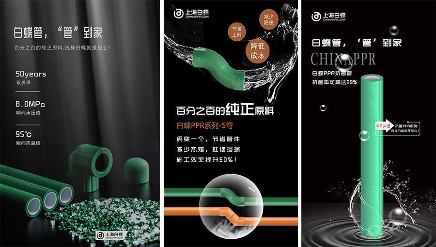 主要产品:白蝶PP-R管、PP-R抗菌管、PP-R稳态管、PE给水管、PERT地板采暖管、PB管、3S超静音管、PVC-U排水管、PVC-U阻燃线管、HDPE同层排水管等产品