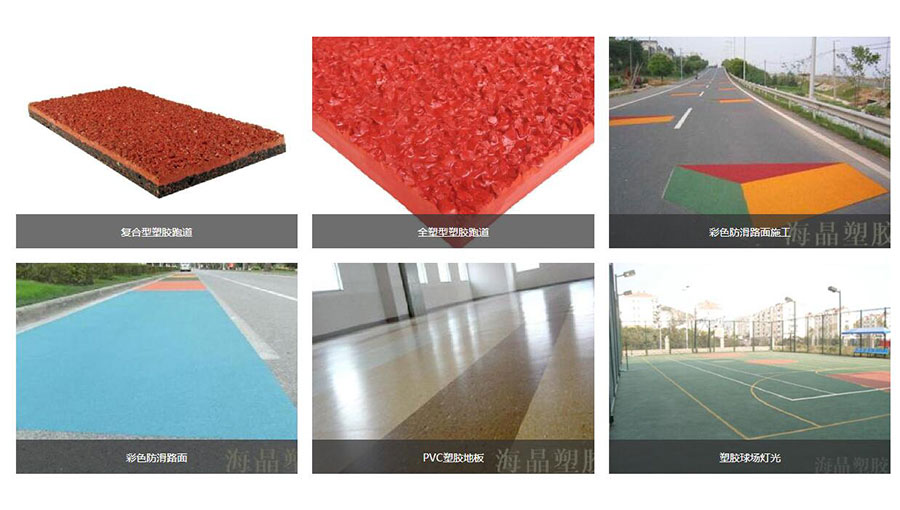 主要产品:海晶牌塑胶跑道、塑胶球场、体育场馆、健身步道、人造草坪等