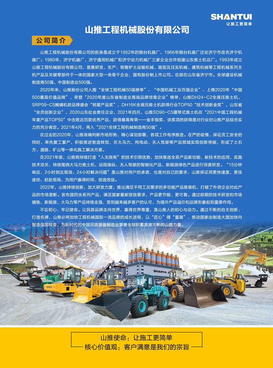 主要产品:SHANTUI推土机、压路机、平地机、装载机、摊铺机、铣刨机、挖掘机、吊管机、推耙机、移设机、垃圾压实机系列主机产品及工程机械零部件