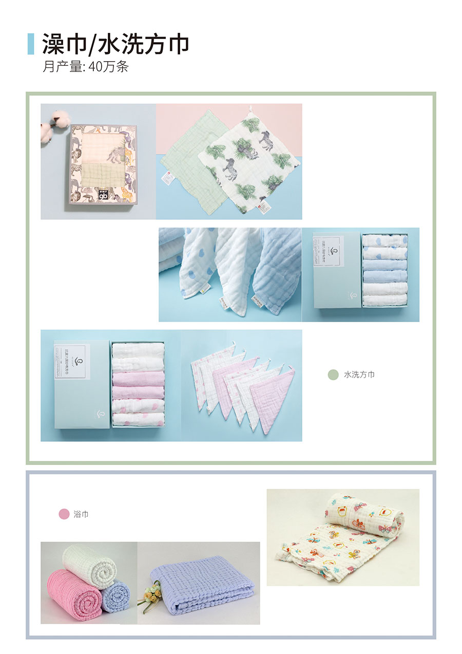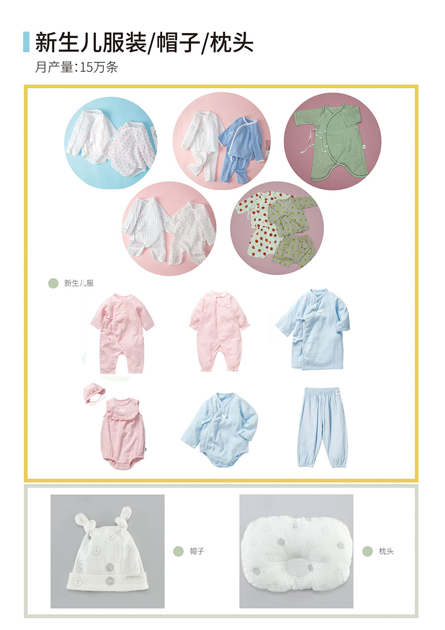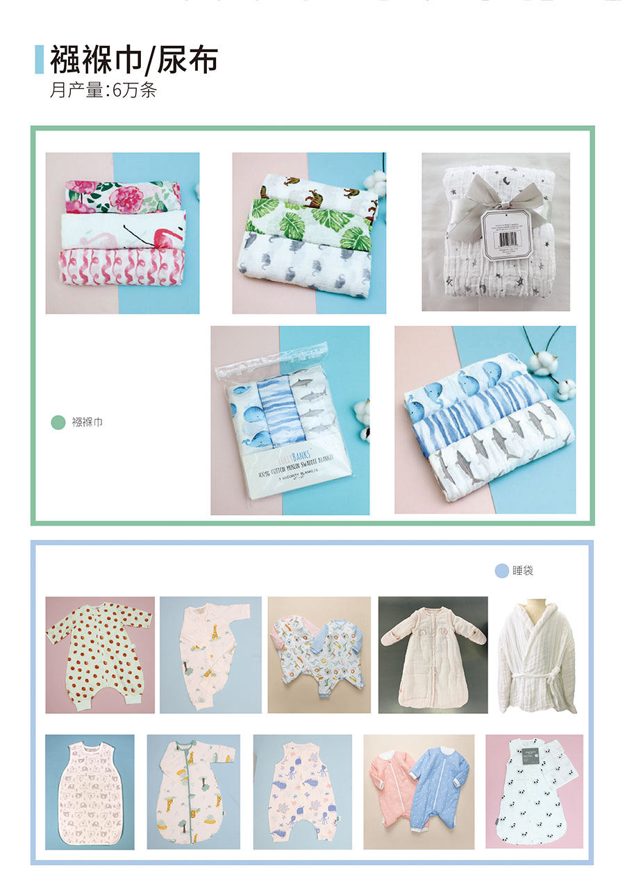 主要产品:毕生宝贝婴幼儿纺织品(尿布、睡袋、围嘴、水洗抱被、浴巾、手帕),医疗用品(绷带、缝纫线,漂白荧光布、漂白荧光纱,弹力布)