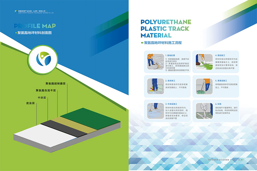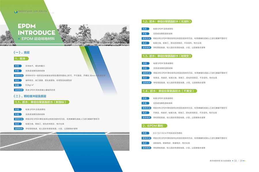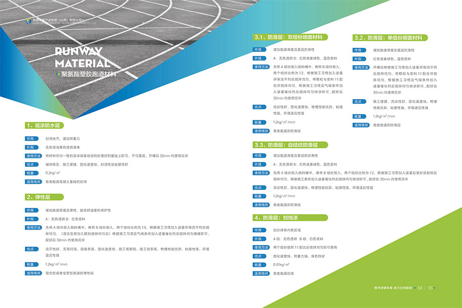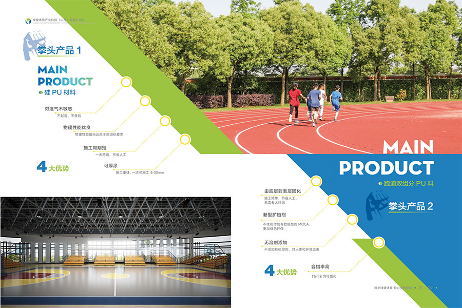 主要产品:水性硅PU球场材料、水性塑胶跑道材料、水性地坪材料、环保无溶剂胶水、双组份跑道材料、EPDM颗粒、水性纳米看台漆、陶瓷颗粒防滑步道、沥青路面改色、无溶剂聚氨酯材料、水性聚氨酯砂浆等产品
