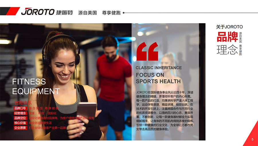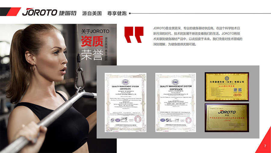 力昂代理的JOROTO品牌在国际健身事业风云近四十年,深谙健身理念的精髓,更懂倾听客户的内心所需。每一款产品的打造,均秉承科学严谨人体工程学、运动学等原理,精益求精,细致钻研。在技术的开发引进上,注重跨国合作与不同行业的优质资源整合,以海纳百川的心态,兼容并蓄,不断创新,让每一款健身器材都全力实现细腻精准,让身体的不同肌肉得到适度的锻炼,引领一种健康的行业文化,为全球亿万都市男女带去高品质的健身体验。