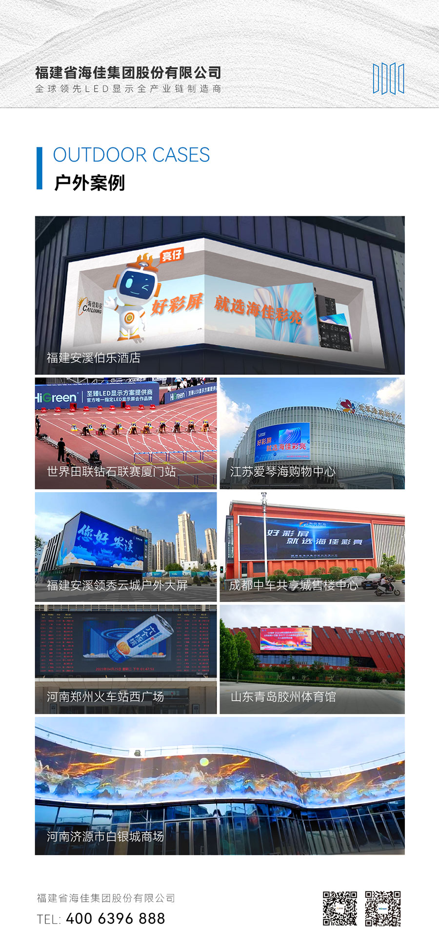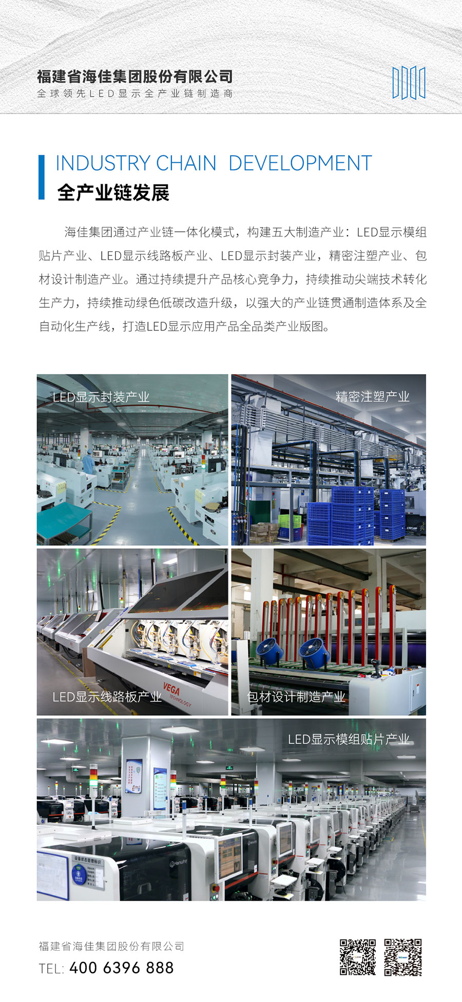 福建省海佳集团股份有限公司成立于2011年,是全球领先LED显示全产业链制造商,作为集研发、制造、销售、服务为一体的国家高新技术企业,海佳集团拥有成熟的LED显示全产业链体系,依托50万平方米的三大独立智能制造基地,以链式一体化发展覆盖LED显示应用产品全生命周期,深度构建LED显示应用产品重度垂直的全产业链经营模式。