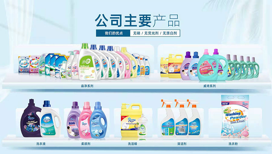 主要产品:淼净、威琦、richeng洗洁精、洁厕净、洗衣粉、厨房重污清洁剂、洗衣液、柔顺剂、母婴织物洗护等
