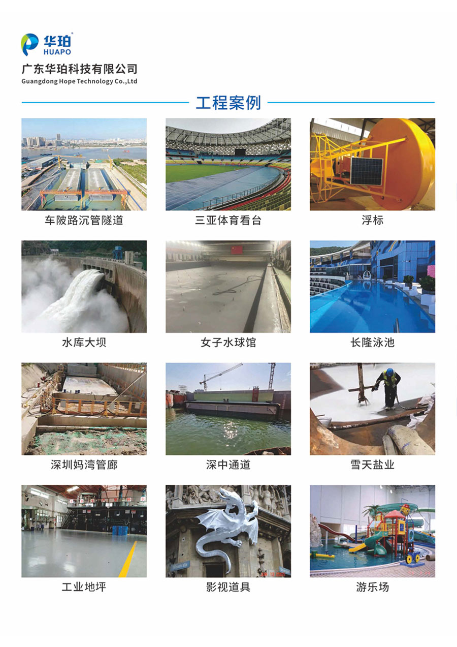 华珀公司是华南地区聚脲种类齐全、产品配套完善、施工经验丰富的专精特新型企业,能够从产品、设备、工艺和施工等环节为客户提供全方位服务。华珀公司先后参与了多项国家重大型及标志性工程项目建设,如港珠澳大桥、深中通道、三亚体育馆、黄腾峡水库大坝、长隆泳池、福田汽车、比亚迪汽车、雪天盐业储罐、鄂尔多斯煤矿设备等。
