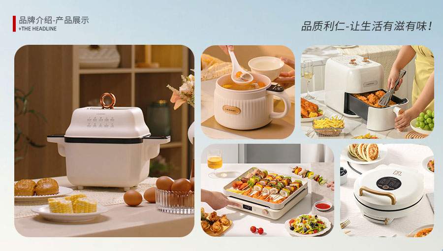 主要产品:“LIVEN利仁”电饼铛、空气炸锅、电火锅、养生壶、电压力锅、电烧烤盘、绞肉机、切菜机(菜馅机)、电饭煲、电蒸锅、电水瓶、电水壶、加湿器、蒸汽拖把、磨粉机、和面机、电烤箱、炒锅、厨房小工具、户外烧烤炉、烤串机