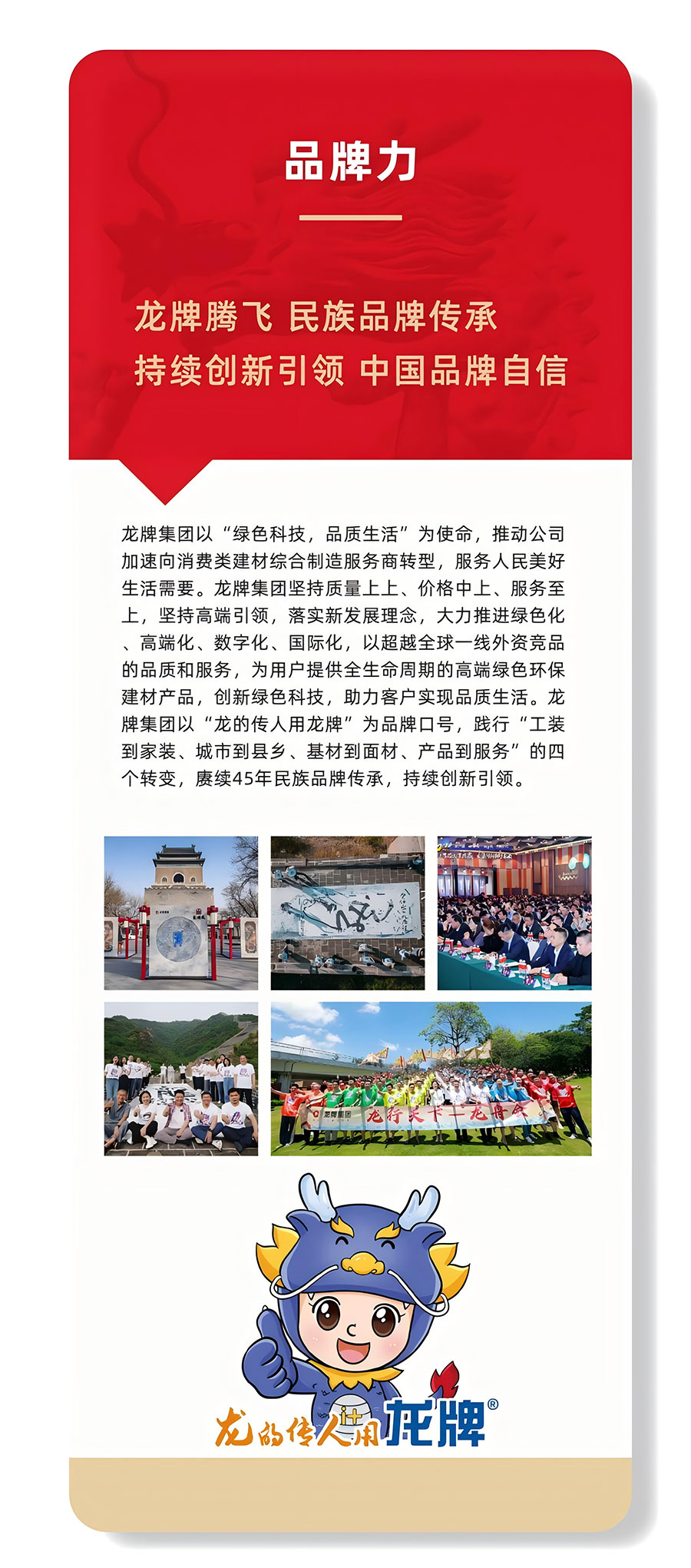 龙牌集团是世界500强中央企业,中国建材集团所属绿色建筑新材料产业平台北新建材核心业务板块公司。以“绿色科技,品质生活”为使命,赓续龙牌四十年荣光,加速向消费类建材综合制造服务商转型,实现“工装到家装、城市到县乡、基材到面材、产品到服务”四个转变,服务美好生活需要。