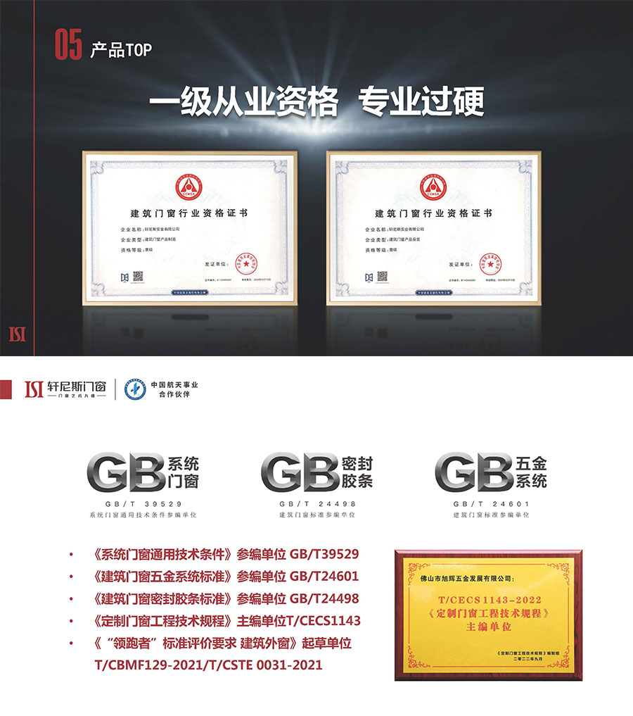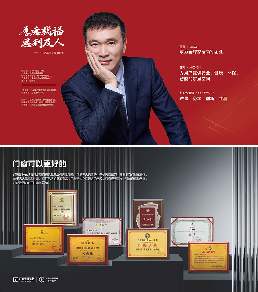 轩尼斯门窗凭借匠心品质及综合实力,轩尼斯门窗成为“中国航天事业合作伙伴”;首批“有家就有佛山造”产业IP授权企业;独家冠名「湾区之夜」经典金曲演唱会;成为郭富城「舞林星传」世界巡回演唱会(广州站)指定门窗品牌;《定制门窗工程技术规程》唯一主编门窗企业;佛山市“专精特新”企业等殊荣;第十二届全国政协副主席马培华亲自见证授予轩尼斯门窗“博鳌国际生态环境示范基地”称号。同时荣膺法国FDA设计金奖、美国MUSE设计金奖、美国IDEA奖、红棉中国设计奖等国际重量级奖项;通过CZC中窗产品认证、欧盟CE认证、德国被动房研究所PHI权威认证、中国绿色建材产品三星级最高认证、中国质量检验协会六项认证。荣誉的背后,是轩尼斯门窗行业地位与综合实力的有力印证。