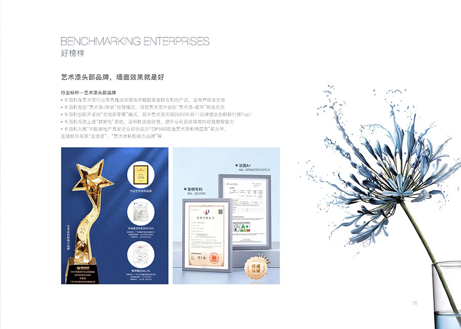 卡百利自主创新研发降解甲醛技术,打造“醛变水”超级符号,并全线升级净醛产品。卡百利的净醛艺术漆能主动捕获室内空气中的游离甲醛,分解为水分子和稳定的无害物质,产品拥有祛甲醛专利证书、法国A+环保认证、中国绿色建材认证、美国绿色卫士金级认证等权威认证,再次证明了其在环保领域的领先地位。
