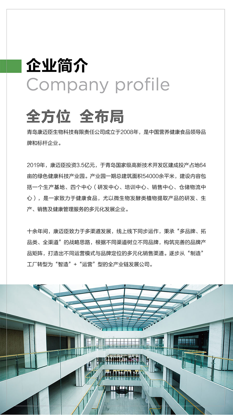 青岛康迈臣生物科技有限责任公司成立于2008年,是中国营养健康食品领导品牌和标杆企业。