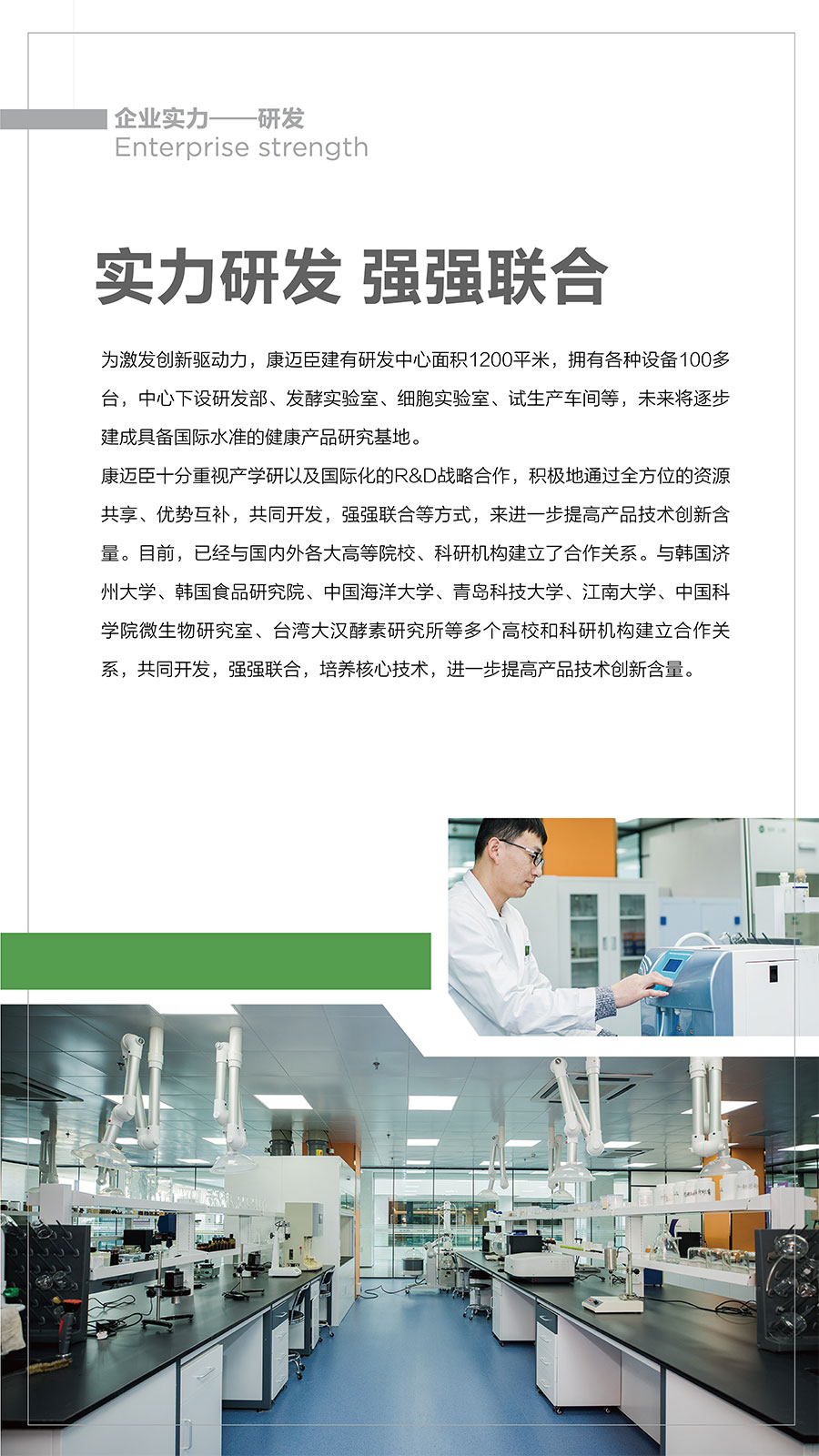 为激发创新驱动力,康迈臣建有研发中心面积1200平方米,拥有各种设备100多台,中心下设研发部、发酵实验室、细胞实验室、试生产车间等,未来将逐步建成具备国际水准的健康产品研究基地。