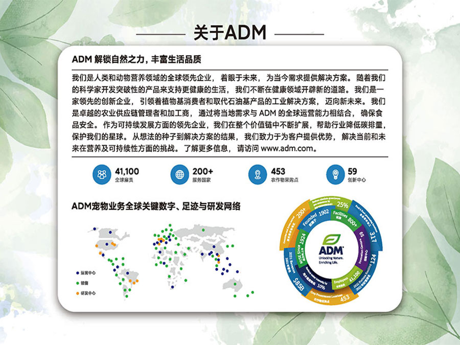 ADM作为人类、动物及宠物营养领域的全球前沿企业,致力于宠物营养领域的创新,不断开发出突破性的宠物产品,为中国的养宠家庭提供更加全面、精准的营养解决方案。