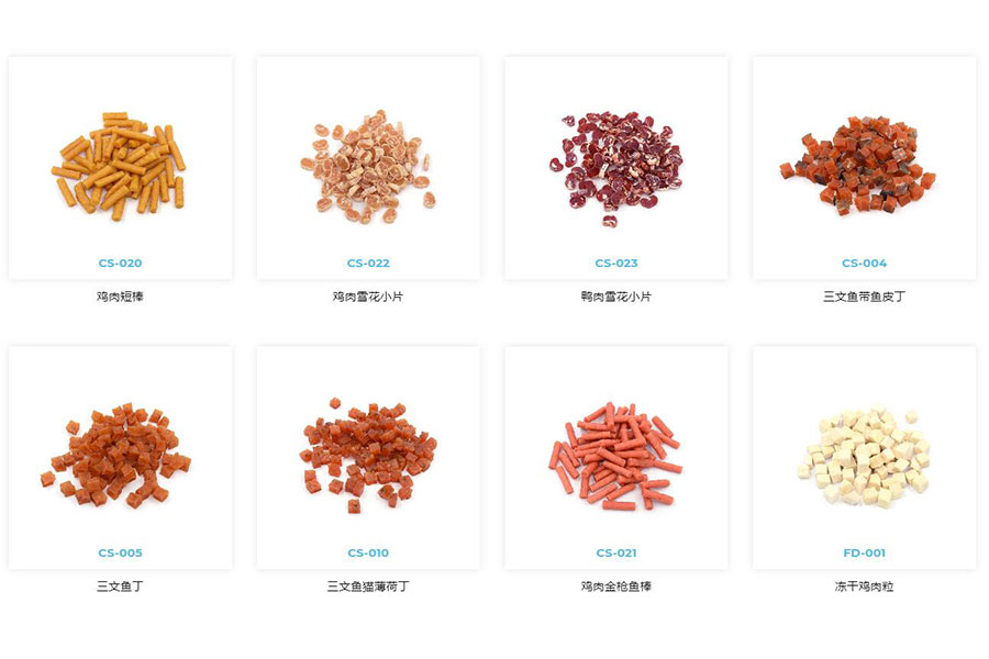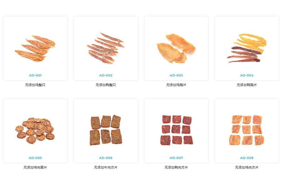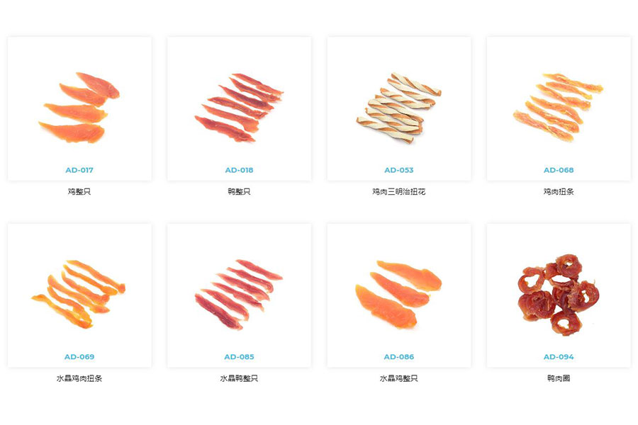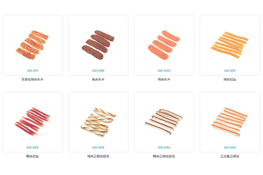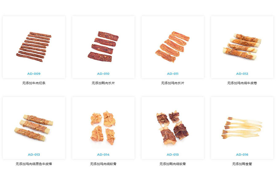 主要产品:海派干鸡肉零食、干鸭零食、鱼肉零食、牙科零食、咀嚼片混合肉包等
