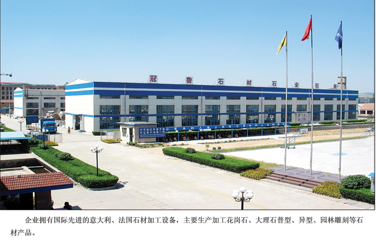 山东冠鲁置业有限公司创建于1992年,于2002年7月成立中美合资企业,注册资本744.8万美元,2007年总资产78142万元,实现利税13221万元,现有员工4536人。公司拥有意大利贝德利尼流水线3条,法国天宝异形流水线1条,国产加工设备600多台套,企业设备技术、生产工艺水平和生产能力,多年来一直处于国内同行业领先水平。年产花岗石、大理石、板岩、石材复合板270多万平米。企业注册商标为“冠鲁”,于2004年被评为“山东省著名商标”。