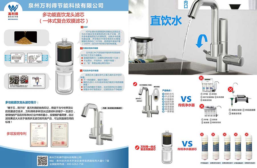 经过6年时间的潜心研发,打造出“精于芯简于形”的净水处理终端设备,获得了100多项国家专利,重新定义了净水器,颠覆了传统水龙头和净水设备两类行业。设备的核心是一体式复合双膜滤芯,采用超滤膜、活性炭纤维膜等多种世界级顶尖滤料,一级滤膜为超低压大通量PE超滤纳米膜,可滤除大分子颗粒、有机物、微生物等;二级滤膜为超强吸附活性纤维膜,可吸附三氯甲烷、挥发性酚、游离氯、溶解性铅等;三级滤料KDF可除去水中余氯和重金属等,产品通过国家疾控中心的检测报告和福建省涉及饮用水卫生安全产品的卫生许可批件,产品结构灵活且体积小巧,仅为传统净水器的五分之一,相当于400ML矿泉水瓶的大小,安装维护非常简便,过滤效果大大优于使用多支滤芯的传统净水器,同时也促进我国五金水暖产业转型升级。2013年获中国净水行业十大创新品牌荣誉、国家科技型中小企业技术创新基金立项,2014年获“福建省科技型企业”证书、“高新技术企业”证书,2015年福建省知识产权优势企业。